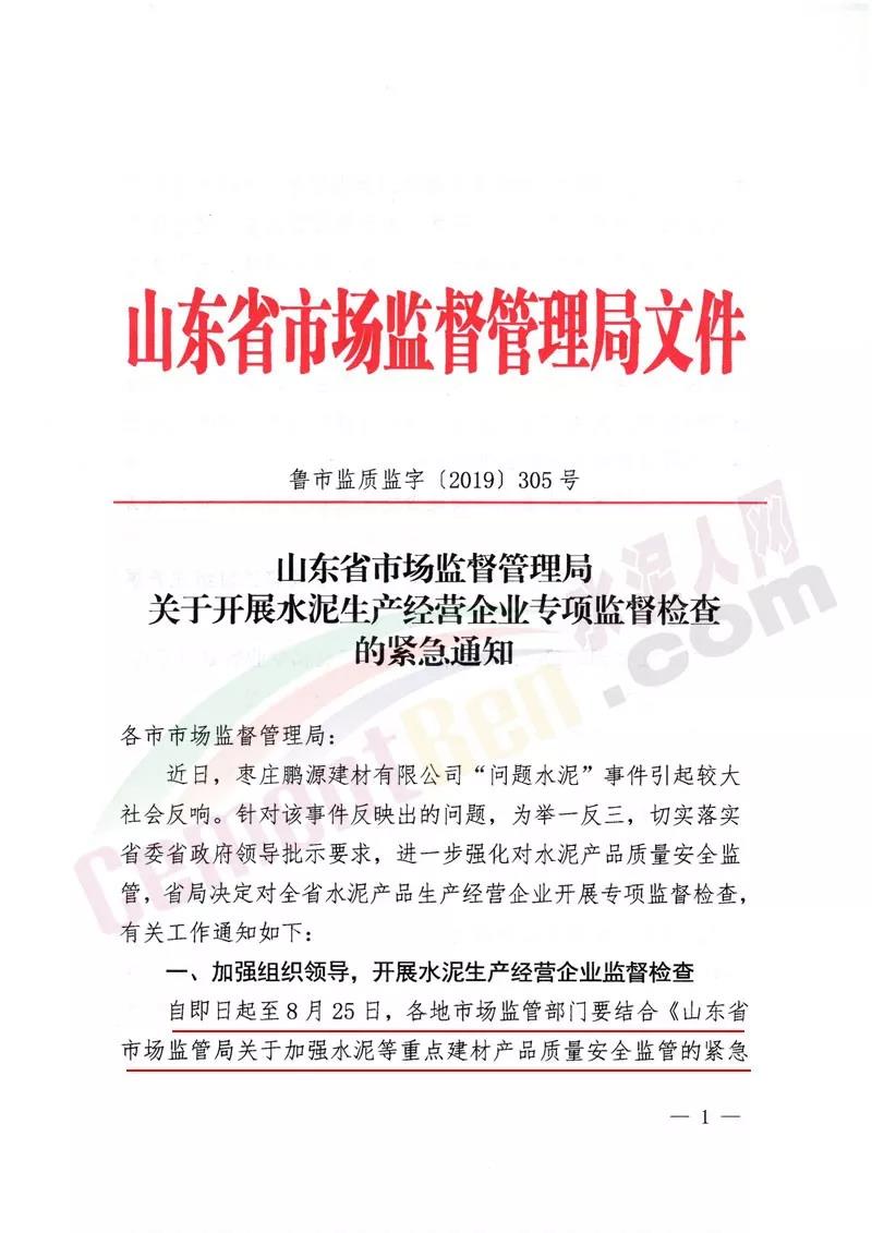 據水泥人網了解,山東各地的通知源于2019年7月29日的一份通知。通知稱:自即日起至8月25日,各地市場監管部門要結合《山東省市場監管局關于加強水泥等重點建材產品質量安全監管的緊急通知》(局函(2019)240號)要求,加強領導,組織力量對轄區內全部水泥產品獲證企業開展一次專項監督檢查。