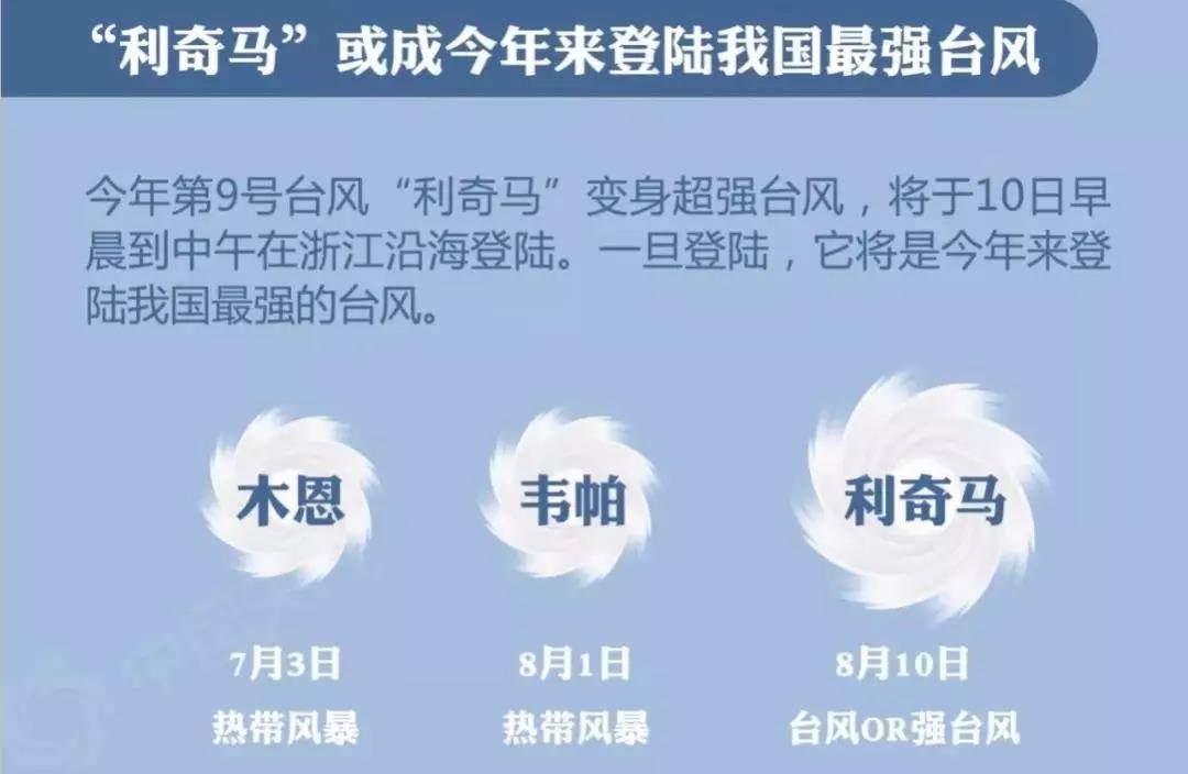 登陸強度強——截至8月8日,今年已有兩個臺風登陸中國,分別為第4號臺風“木恩”和第7號臺風“韋帕”,登陸時強度為熱帶風暴級,風力分別為8級、9級,而臺風“利奇馬”登陸時強度最低將是臺風級(13級)。
