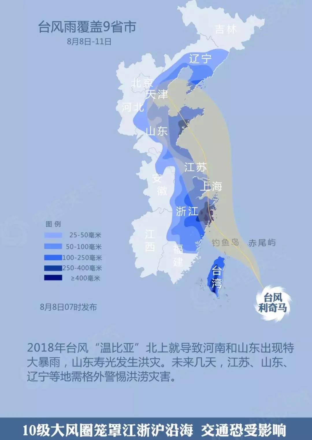 影響范圍廣——臺灣、福建、浙江、上海、江蘇、山東、天津、遼寧等8省市將受到臺風直接影響。后期,臺風和冷空氣結合還會給華北東部、東北等地帶來大范圍強降雨。