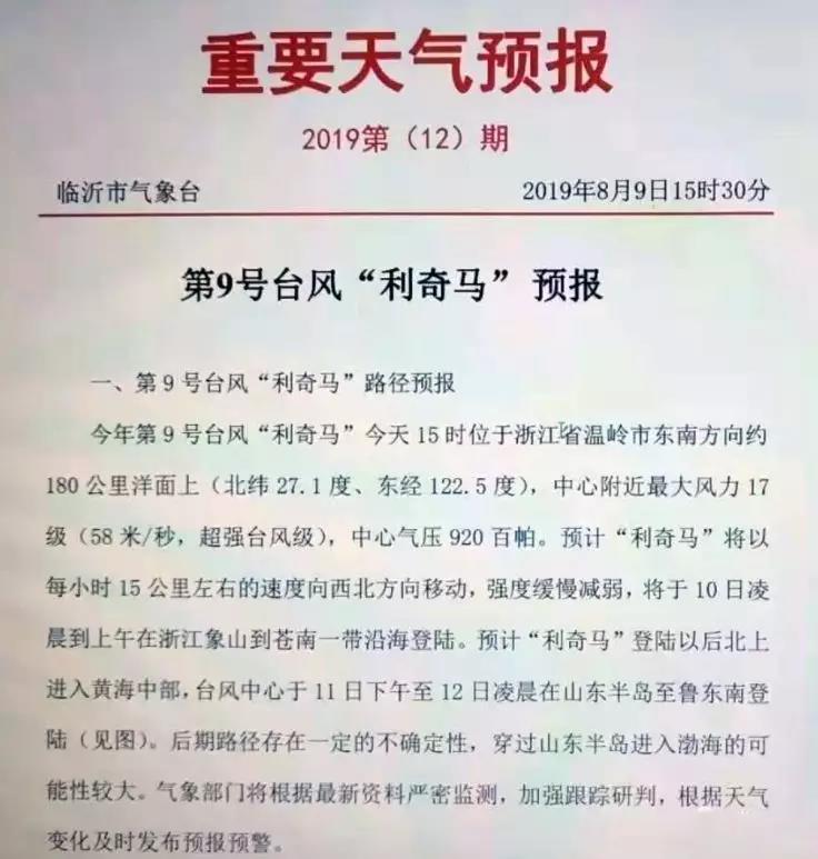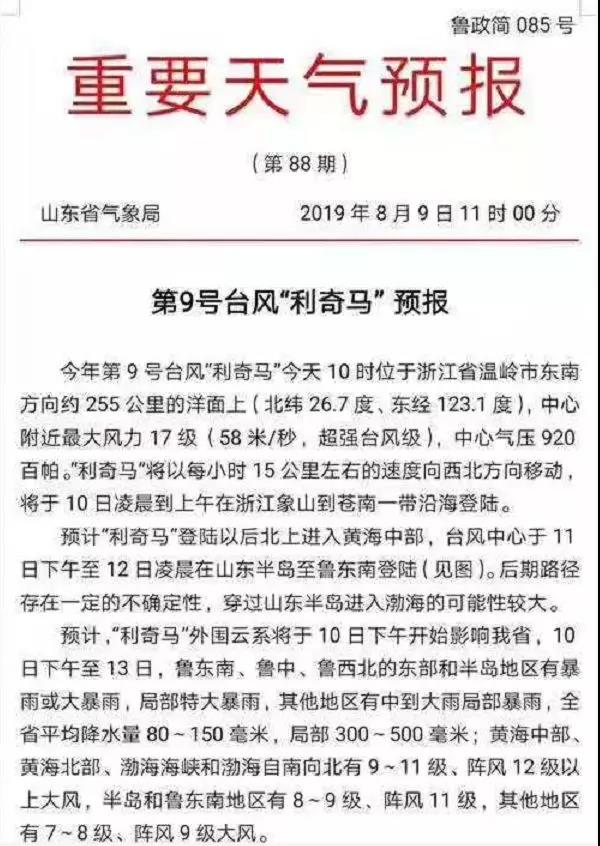 山東省氣象局發布第9號臺風“利奇馬”預報稱,預計臺風中心于11日下午至12日凌晨在山東半島至魯東南登陸。后期路徑存在一定的不確定性,穿過山東半島進入渤海的可能性較大。預計“利奇馬”外圍 云“系于10日下午開始影響山東省。
