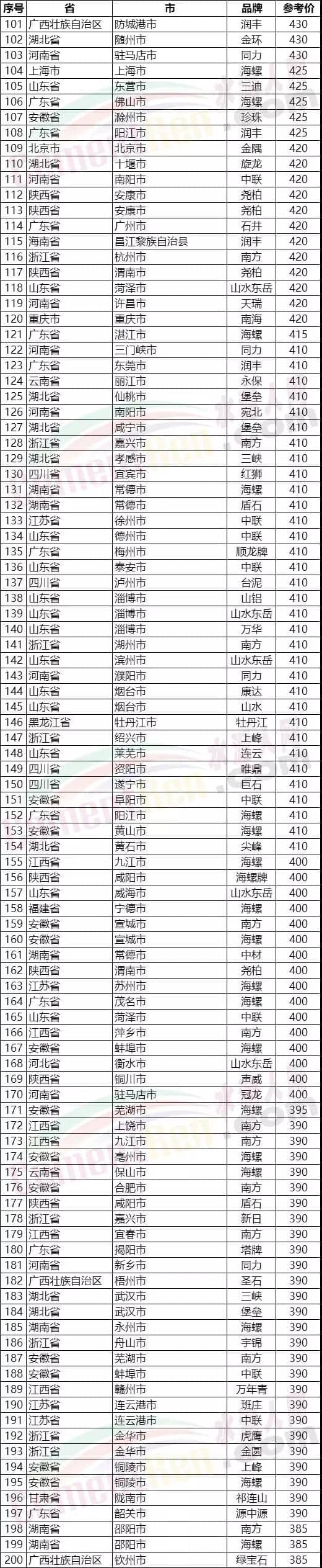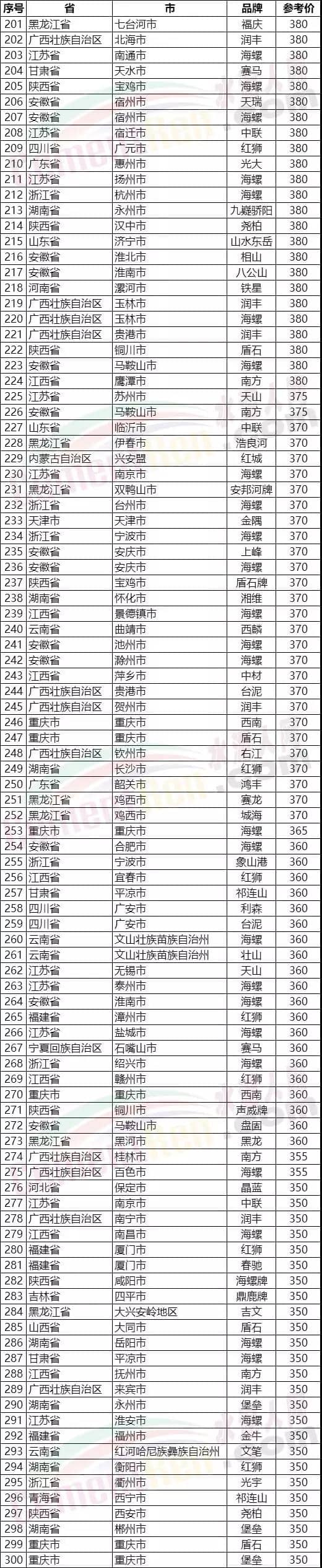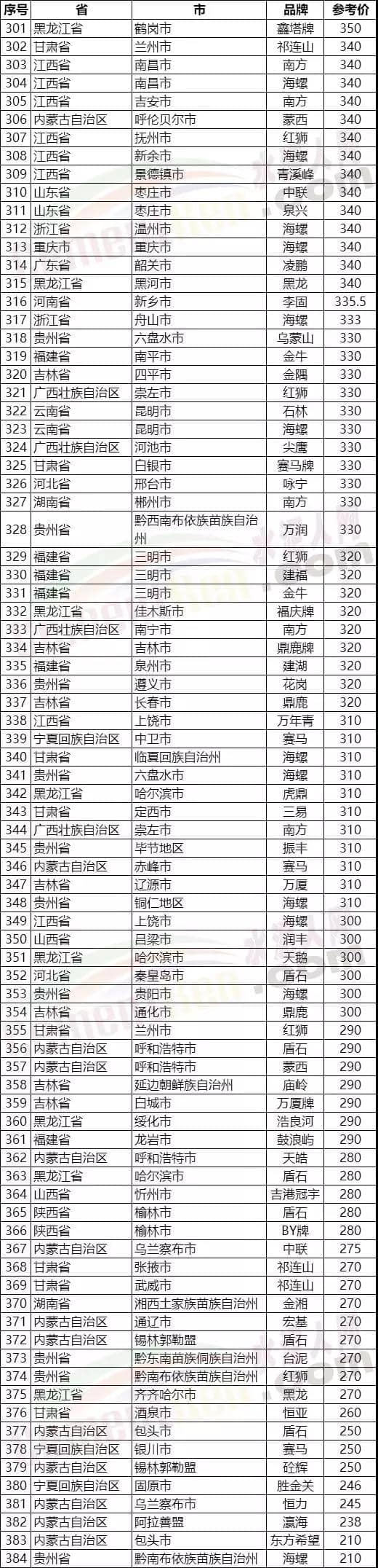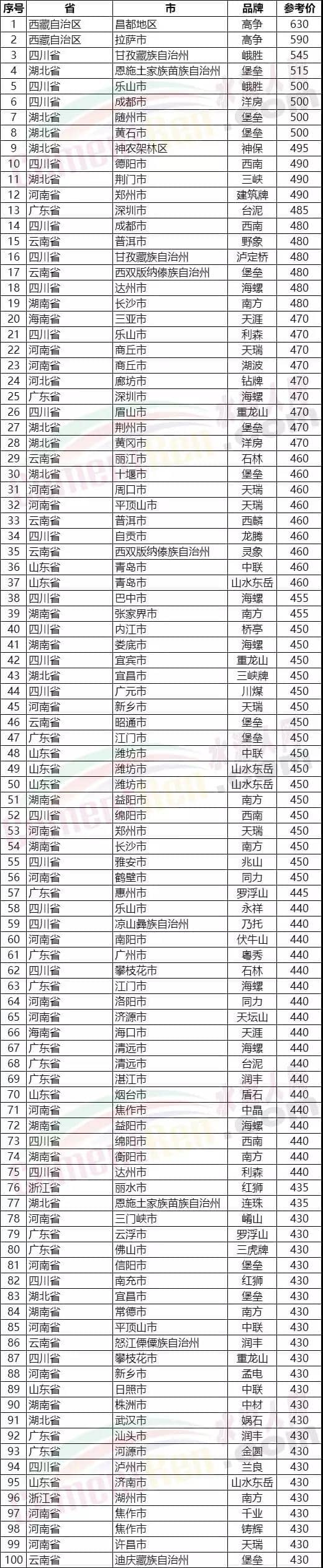從水泥人網信息中心監管的近400家PC32.5R包裝水泥價格數據來看, 報價最高區域仍為西藏區域,其中昌都高爭水泥報價630元/噸,最低報價為貴州黔南布依族苗族自治海螺水泥及內蒙古自治區包頭市東方希望水泥報價210元/噸。