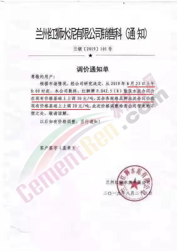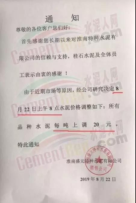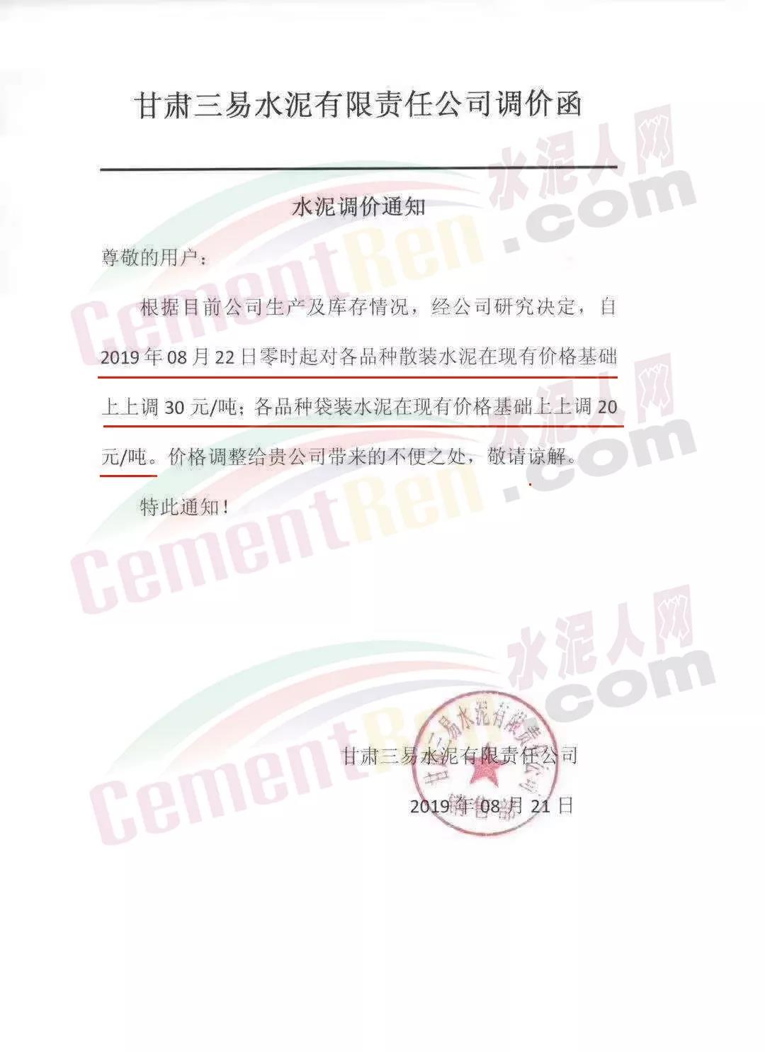 結(jié)合當(dāng)前周邊市場(chǎng)行情,經(jīng)公司商議決定自2019年8月22日上午9:30分整,32.5水泥袋裝、散裝在原價(jià)格基礎(chǔ)上每噸上調(diào)10元;42.5水泥袋裝、散裝在原價(jià)格基礎(chǔ)上每噸上調(diào)10元,特此通知!