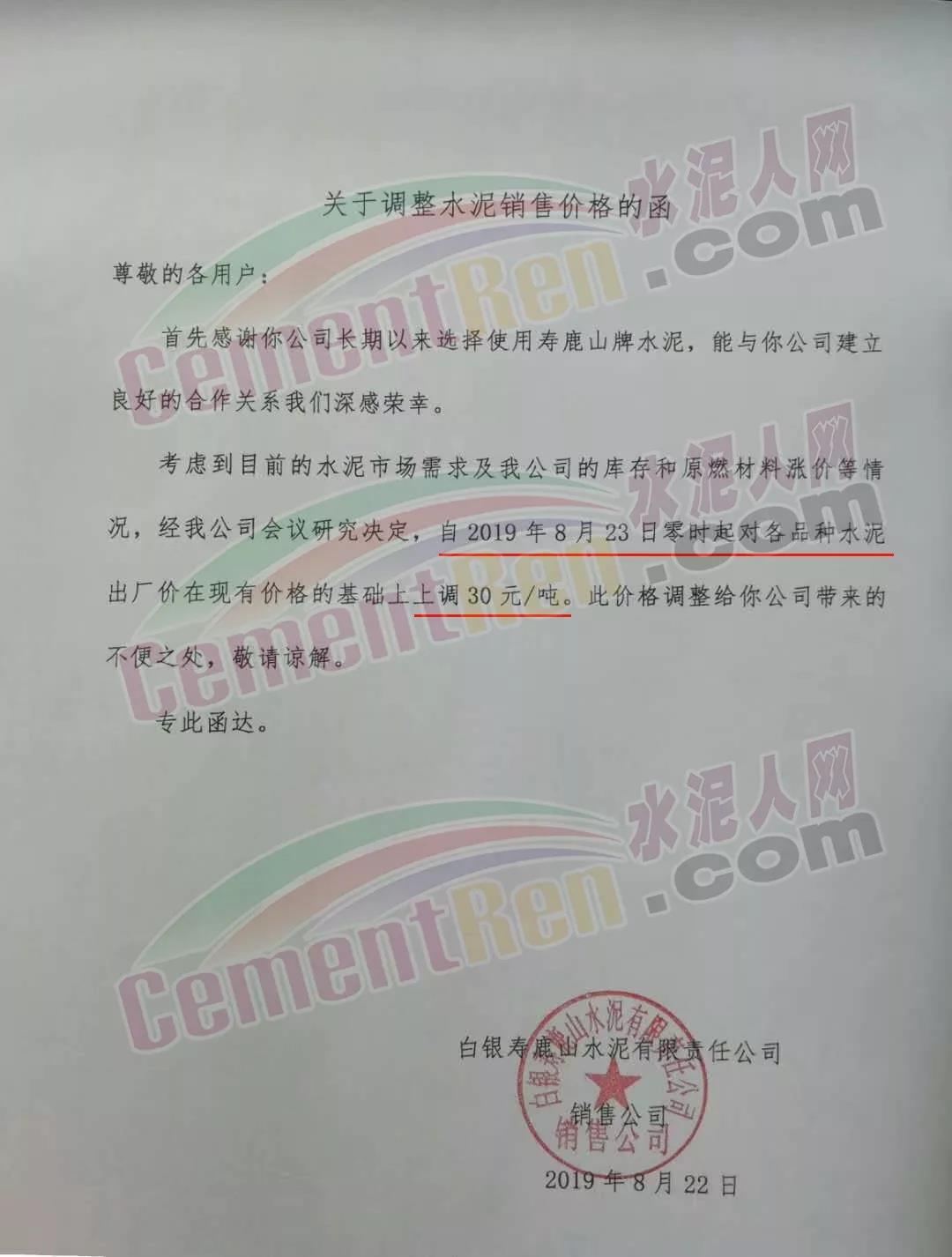 因近期原燃材料成本上漲,我公司現(xiàn)決定于2019年8月22日8:00針對(duì)PO42.5散裝價(jià)格進(jìn)行調(diào)整,價(jià)格上調(diào)60元/噸。