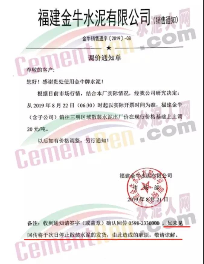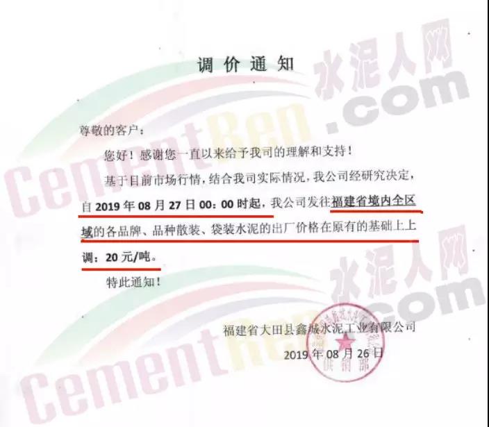 8月26日,福建省大田縣鑫城水泥工業有限公司發布調價通知稱:基于目前市場行情,結合我司實際情況,我公司經研究決定,自2019年8月27日00:00時起,我公司發往福建省境全區域的各品牌、品牌散裝、袋裝水泥的出廠價格在原有的基礎上上調20元/噸。