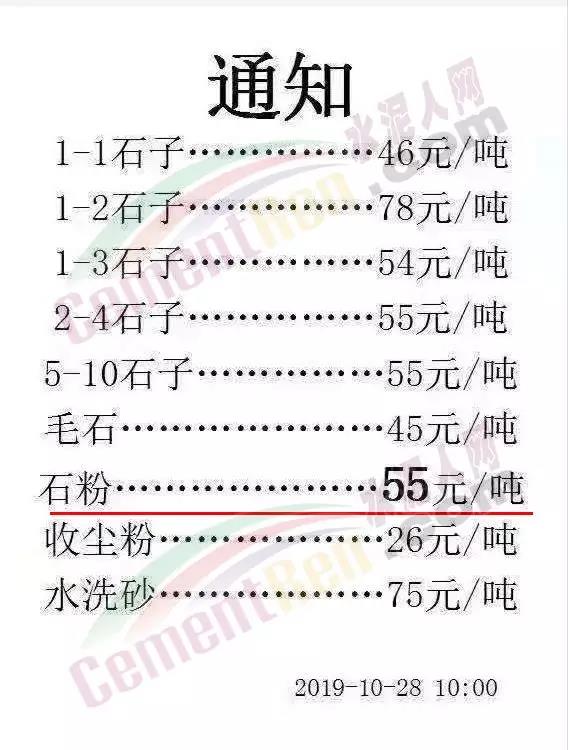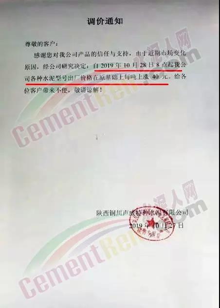 接公司通知從2019年10月24日上午8:00起,32.5R水泥價格在原來的基礎上上調15元/噸,請互相轉告。
