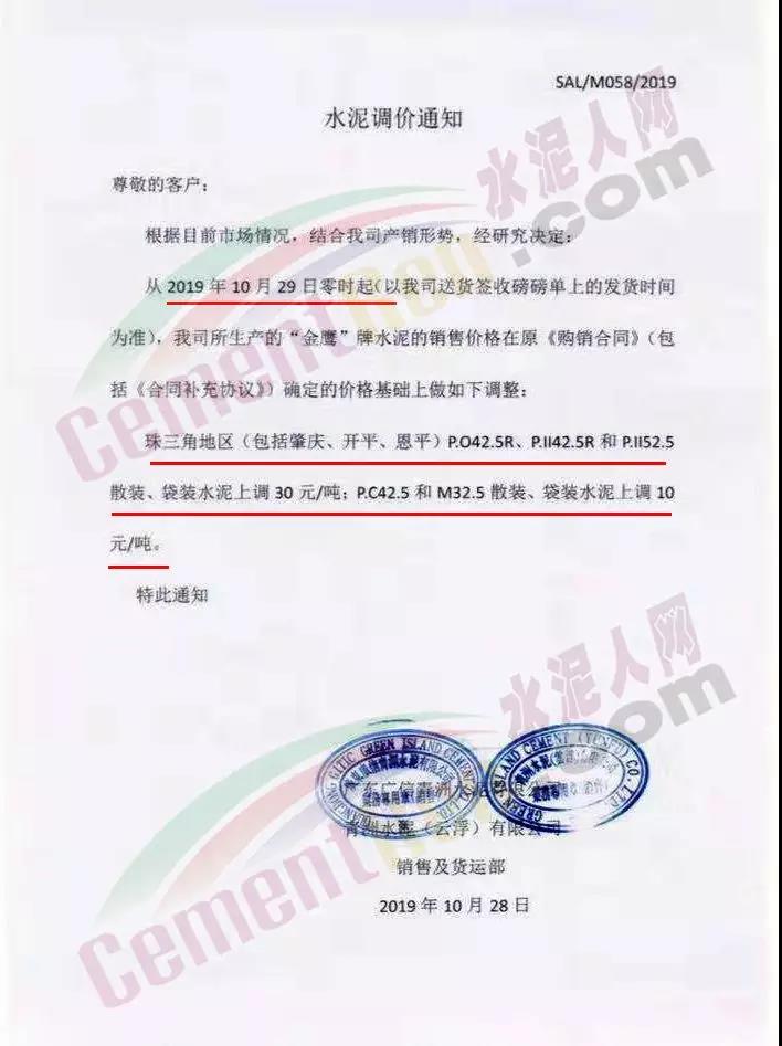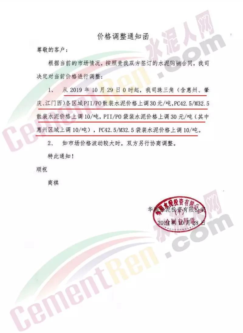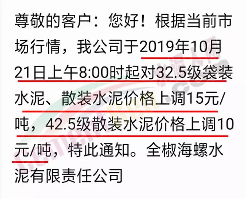 您好!根據原材料價格上漲,結合本公司實際情況。經研究決定,自2019年10月23日8:00起,本公司水泥在原價格基礎上上調30元/噸。