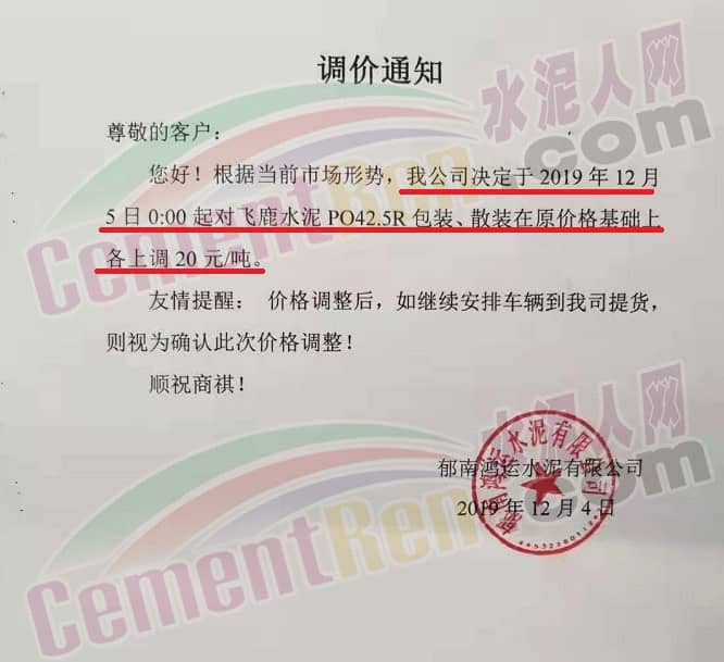 郁南鴻運水泥有限公司通知自12月5日0時起對飛鹿水泥PO42.5R包裝、散裝在原價格基礎各上調20元/噸。
