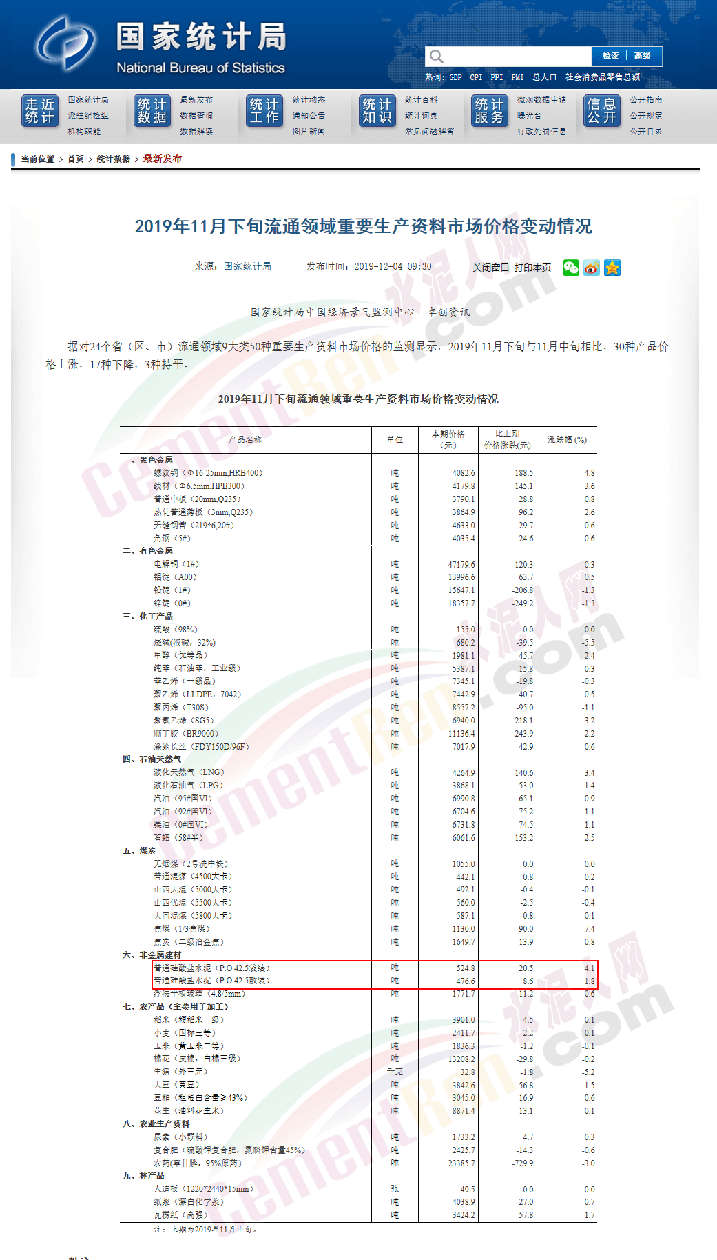 國家統計局近期對24個省(區、市)流通領域9大類50種重要生產資料市場價格的監測數據顯示,2019年11月下旬與11月中旬相比,30種產品價格上漲,17種下降,3種持平。其中非金屬建材普通硅酸鹽水泥(P.O 42.5袋裝)均價524.8元/噸,較上期上漲20.5元/噸,漲幅4.1%;普通硅酸鹽水泥(P.O 42.5散裝)均價476.6元/噸,較上期上漲8.6元/噸,漲幅1.8%。這個價格已超過2018年的最高點,創2011年以來的最高價。