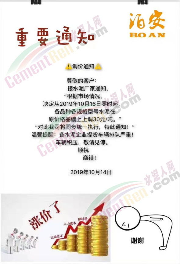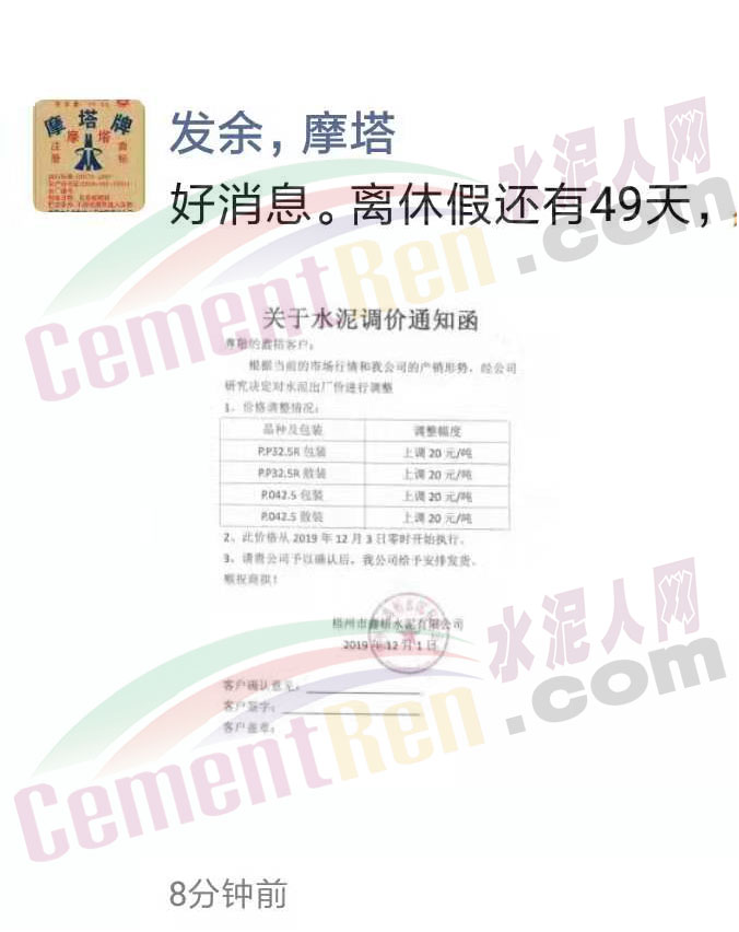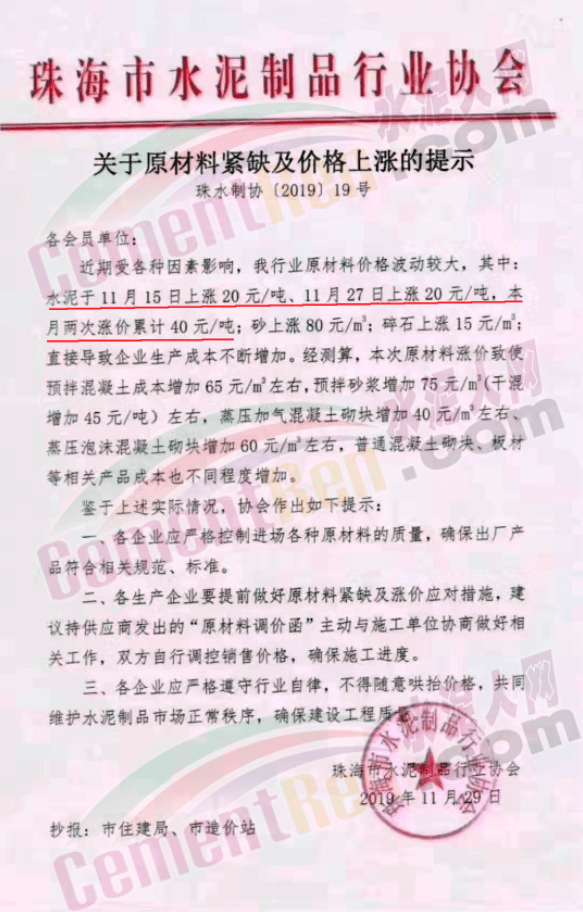日前,廣東北江實業集團有限公司發調價通知稱,由于市場價格變動影響,公司決定 對水泥出廠價格做出調整。自12月6日零時開始P.P32.5R(包、散裝)、PO42.5R(包裝、散裝)水泥在原單價基礎上上調20元/噸。