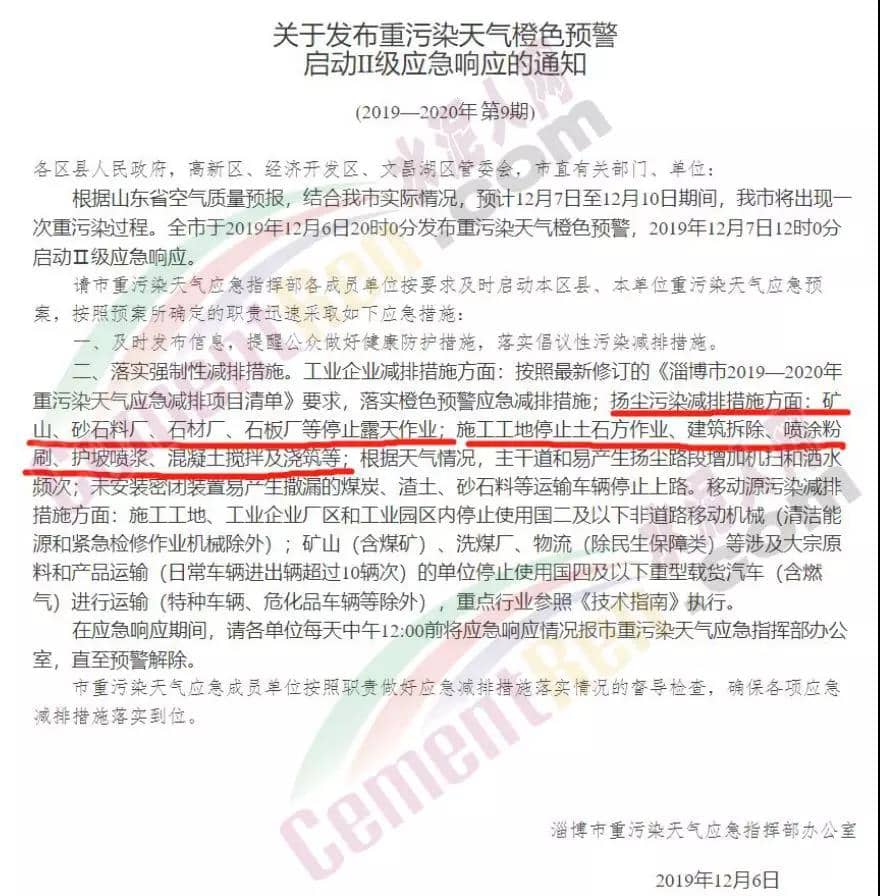 淄博市發(fā)布《重污染天氣橙色預(yù)警,啟動Ⅱ級應(yīng)急響應(yīng)的通知》,礦山、砂石料廠、石材廠、石板廠等停止露天作業(yè);施工工地停止土石方作業(yè)、建筑拆除、噴涂粉刷、護(hù)坡噴漿、混凝土攪拌及澆筑等;