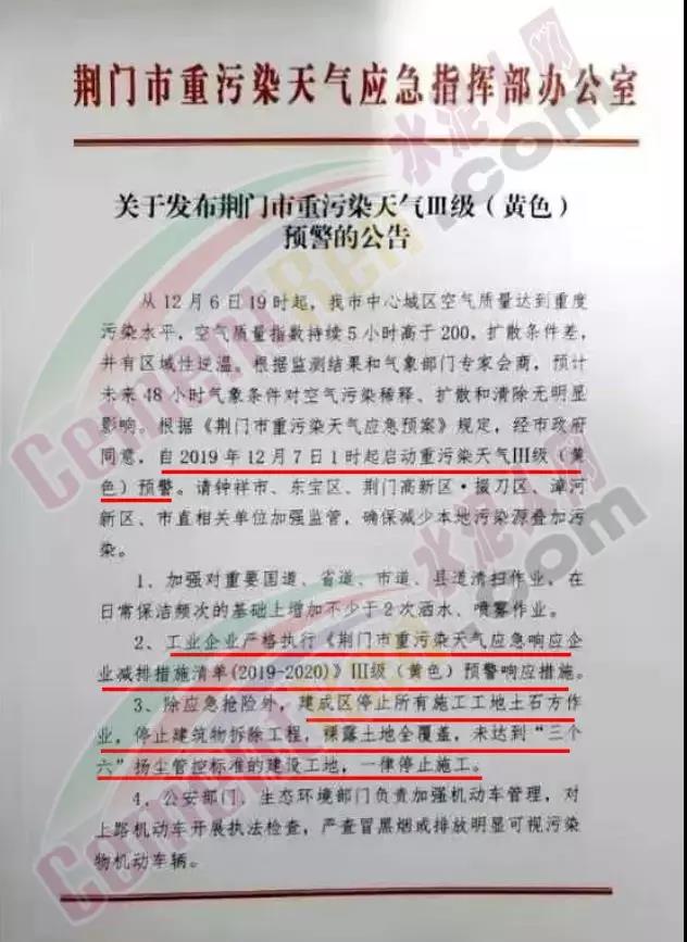 湖北荊門市重污染天應(yīng)急指揮部辦公室發(fā)布《荊門市重污染天氣III級(黃色)預(yù)警的公告》稱,自12月6日19時(shí)起,荊門市中心城區(qū)空氣質(zhì)量達(dá)到重度污染水平,經(jīng)市政府同意,自2019年12月7日1時(shí)起啟動重污染天氣III級預(yù)警。除應(yīng)急搶險(xiǎn)外,建成區(qū)停止所有施工工地土石方作業(yè),停止建筑物拆除工程,裸露土全覆蓋,未達(dá)到“三六”揚(yáng)塵管控標(biāo)準(zhǔn)的建設(shè)工地,一律停止施工。