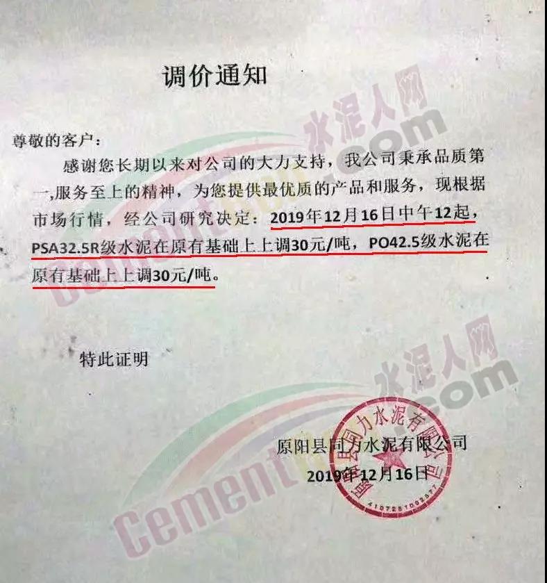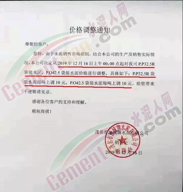 日前,河南省、廣東省及廣西壯族自治區部分區域企業通知上調水泥價格:華潤水泥通知自2019年12月17日零時起惠州地區全品種袋裝、散裝水泥價格上調20元/噸 。廣西合浦南珠水泥廠通知自2019年12月17日起,水泥價格上調30元每噸。茂名市油城牌水泥通知自12月16日0時起,P.P32.5R袋裝水泥,PO42.5袋裝水泥價格上調10元/噸。原陽縣同力水泥通知自12月16日中午12時起,PSA32.5R級、PO42.5級水泥在原執行價格基礎上上調30元/噸。