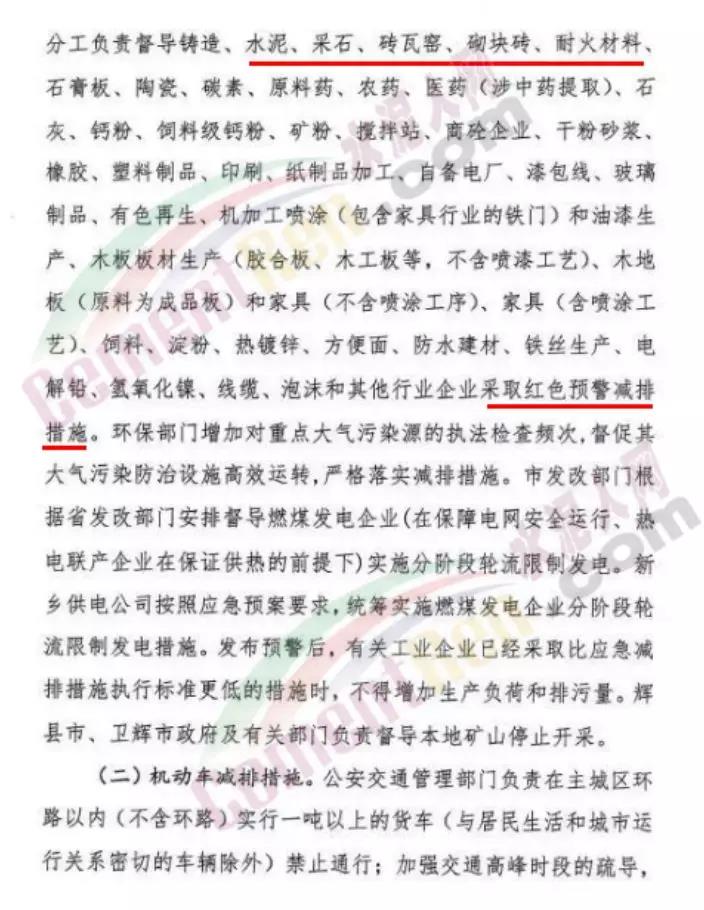 日前,新鄉市環境防治攻堅指揮部辦公室又發一文稱,自12月15日12時起,將新鄉市重污染天氣紅色預警(I級)降至橙色預警(II級),但是全市所有建材行業企業仍舊繼續執行紅色預警管控措施。