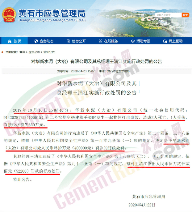 一、對華新水泥(大冶)有限公司及其總經理王清江實施行政處罰的公告
