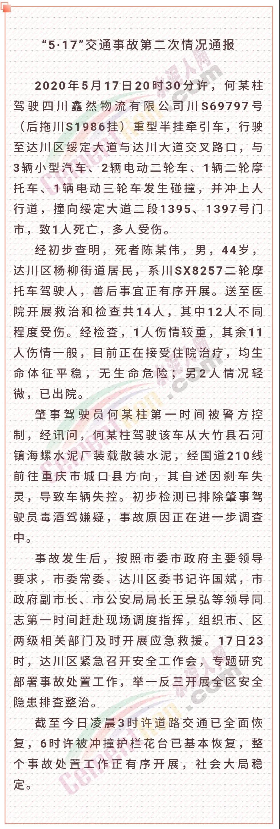 昨日(5月18日)達川區應急管理局發布的“5·17”交通事故第二次情況通報稱:2020年5月17日20時30分許,何某柱駕駛四川鑫然物流有限公司川S69797號(后拖川S1986掛)重型半掛牽引車,行駛至達川區綏定大道與達川大道交叉路口,與3輛小型汽車、2輛電動二輪車、1輛二輪摩托車、1輛電動三輪車發生碰撞,并沖上人行道,撞向綏定大道二段1395、1397號門市,致1人死亡,多人受傷。經初步查明,死者陳某偉,男,44歲,達川區楊柳街道居民,系川SX8257二輪摩托車駕駛人,善后事宜正有序開展。送至醫院開展救治和檢查共14人,其中12人不同程度受傷。經檢查,1人傷情較重,其余11人傷情一般,目前正在接受住院治療,均生命體征平穩,無生命危險;另2人情況輕微,已出院。肇事駕駛員何某柱第一時間被警方控制,經訊問,何某柱駕駛該車從大竹縣石河鎮海螺水泥廠裝載散裝水泥,經國道210線前往重慶市城口縣方向,其自述因剎車失靈,導致車輛失控。初步檢測已排除肇事駕駛員毒酒駕嫌疑,事故原因正在進一步調查中。