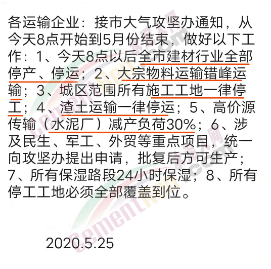 日前,河南省新鄉市相關部門發通知要求轄區內建材行業全部停產、停運;大宗物料錯峰運輸;施工工地一律停工,渣土運輸一律停運,水泥廠減產負荷30%。