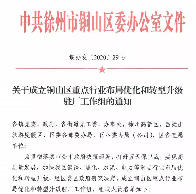 據水泥人網了解,近日江蘇省徐州市銅山區人民政府發布《關于成立銅山區重點行業布局優化和轉型升級駐廠工作組的通知》稱,為貫徹落實市委市政府決策部署,打好藍天保衛戰,實現高質量發展,加快銅山區鋼鐵、焦化、水泥、電力等重點行業布局優化和轉型升級,經區委區政府研究決定,成立銅山區重點行業布局優化和轉型升級駐廠工作組。其中明確指出,淮海中聯水泥工作組工作目標及任務包括:要落實在線監控,嚴禁恢復生產;2020年6月底前協助完成搬遷至賈汪區的項目前期手續。