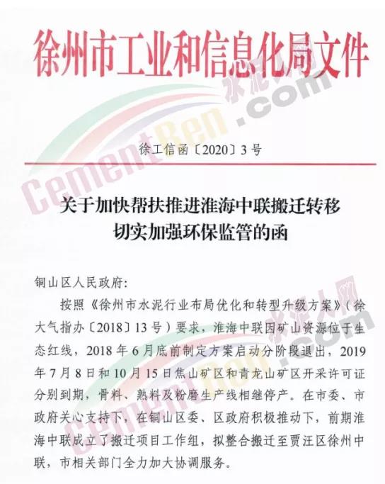 就是這樣一家企業,被要求停產退出。并且在今年3月份,徐州市工信局為了進一步敦促淮海中聯水泥盡快退出,徐州市工信局發布了《關于加快幫扶推薦淮海中聯搬遷轉移切實加強環保監管的函》稱,要求相關部門嚴肅屬地監管責任,組織有關部門立即調查,嚴防礦山資源非法啟動開采,加大污染物在線監測和環境執法力度,切實加強區域道路運輸監管,杜絕外購礦石、擅自復產等現象。