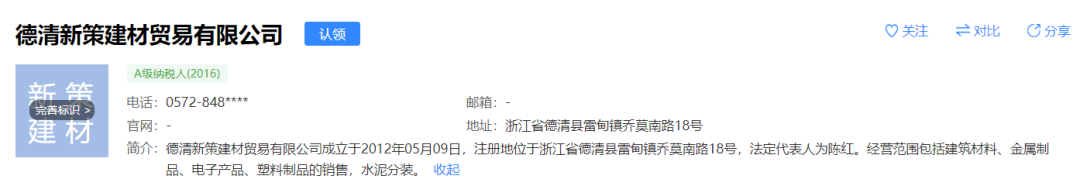 經(jīng)查,德清新策建材貿(mào)易有限公司注冊(cè)地址位于浙江省德清縣雷甸鎮(zhèn)喬莫南路18號(hào),經(jīng)營(yíng)范圍為建筑材料、金屬制品、電子產(chǎn)品、塑料制品的銷(xiāo)售,水泥分裝等。