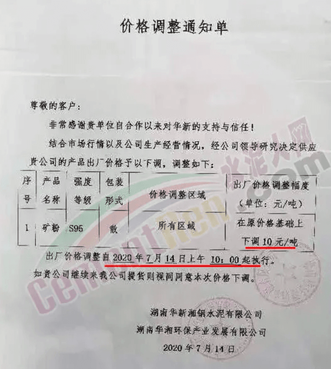 華東某礦粉經(jīng)銷商表示,隨著水泥和熟料價(jià)格的下調(diào),礦粉價(jià)格也隨之降低10-20元/噸。同期,華中大廠華新湘鋼水泥通知結(jié)合市場(chǎng)行情及公司營(yíng)銷情況,經(jīng)公司研究決定自7月14日起下調(diào)S95礦粉價(jià)格10元/噸。