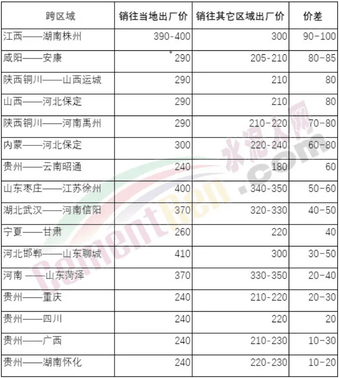 PO42.5水泥,內蒙區域水泥對河北保定市場報價220~240元/噸,對核心市場出廠報價300元/噸。河北邯鄲區域發往山東聊城的水泥出廠報價300元/噸,比本地價格低近百元。貴州主流水泥企業對銷往廣西、云南 、湖南、重慶、四川等區域的42.5散裝水泥出廠為180~220元/噸之間,但是對本地銷售的水泥出廠價多在300元/噸左右,價差在80~120元/噸左右。