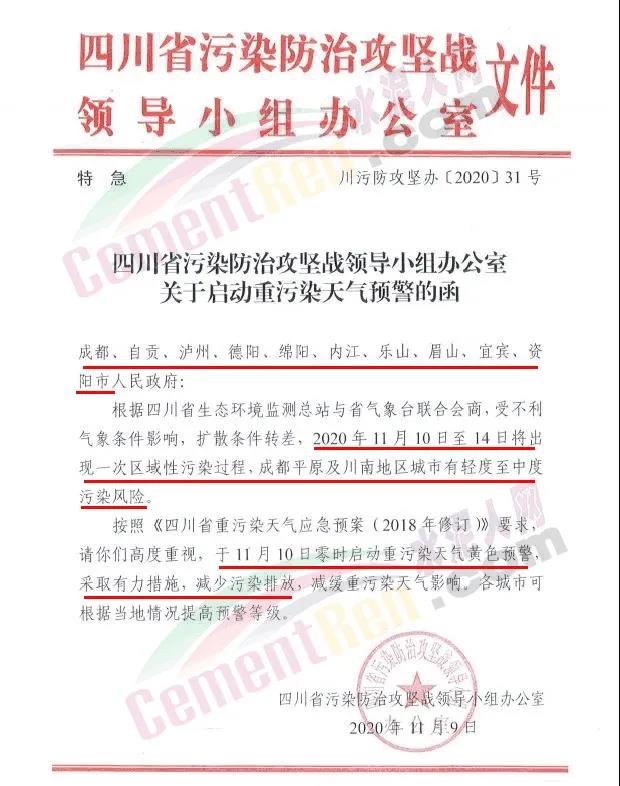 日前,水泥人網從四川省污染防治攻堅戰領導小組辦公室獲悉,11月10日零時,成都、自貢、瀘州、德陽、綿陽、內江、樂山、眉山、宜賓、資陽10市將啟動重污染天氣黃色預警。根據四川省生態環境監測總站與省氣象臺聯合會商,受不利氣象條件影響,擴散條件轉差,2020年11月10日至14日將出現一次區域性污染過程,成都平原及川南地區城市有輕度至中度污染風險。按照《四川省重污染天氣應急預案(2018年修訂)》要求,成都、自貢、瀘州、德陽、綿陽、內江、樂山、眉山、宜賓、資陽應于11月10日零時啟動重污染天氣黃色預警,采取有力措施,減少污染排放,減緩重污染天氣影響。各城市可根據當地情況提高預警等級。