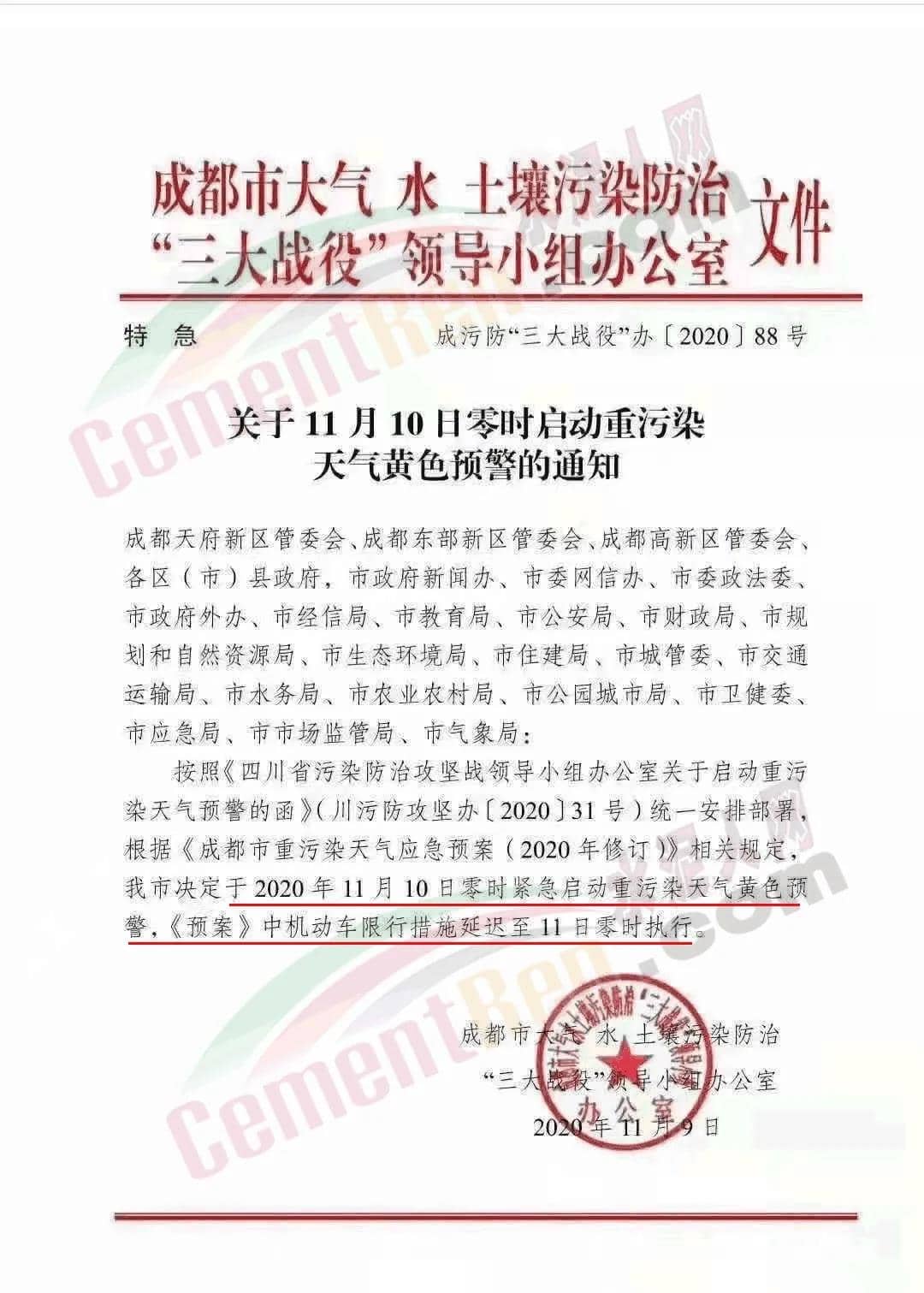 成都市大氣、水、土壤污染防治三大戰役"領導小組辦公室發布特急文件《關于11月10日零時啟動重污染天氣黃色預警的通知》(成污防"三大戰役"辦〔2020〕88號)稱,按照《四川省污染防治攻堅戰領導小組辦公室關于啟動重污染天氣預警的函》(川污防攻堅辦〔2020〕31號)統一安排部署,根據《成都市重污染天氣應急預案(2020年修訂)》相關規定,成都市決定于2020年11月10日零時緊急啟動重污染天氣黃色預警,《預案》中機動車限行措施延遲至11日零時執行。