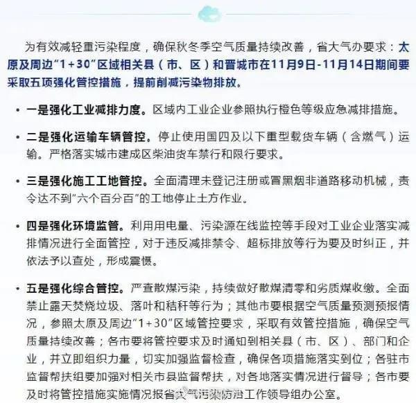 日前,山西省省大氣污染防治工作領導組辦公室印發《山西省大氣污染防治工作領導組辦公室關于做好近期不利氣象條件應對的通知》指出,根據省生態環境監測中心與中國環境監測總站、省氣象部門會商預測,從11月9日開始,全省氣象條件轉差,全省大范圍以輕至中度污染為主,太原、陽泉、晉城、運城、臨汾等部分城市短時可能達到重度污染。