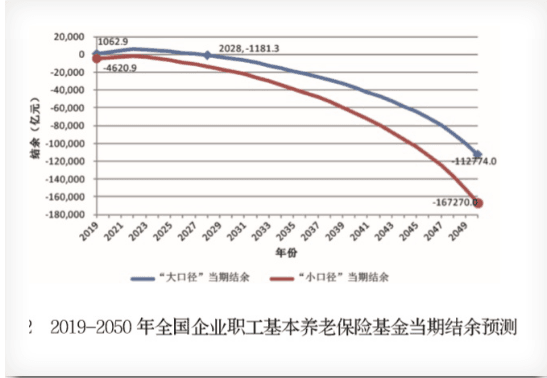 《報告》預測,2019~2050年,全國城鎮企業職工基本養老保險基金當期結余在勉強維持幾年的正數后,將開始加速跳水,赤字規模越來越大。具體來看,2019年當期結余為1062.9億元,并將短暫增長到2022年,然后從2023年開始下降,到2028年當期結余會首次出現負數,達到負1181.3億元,最終到2050年,當期結余可能達到負11.28萬億元。