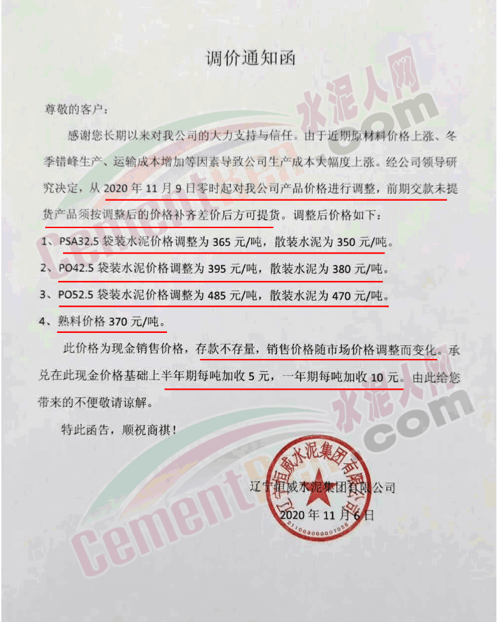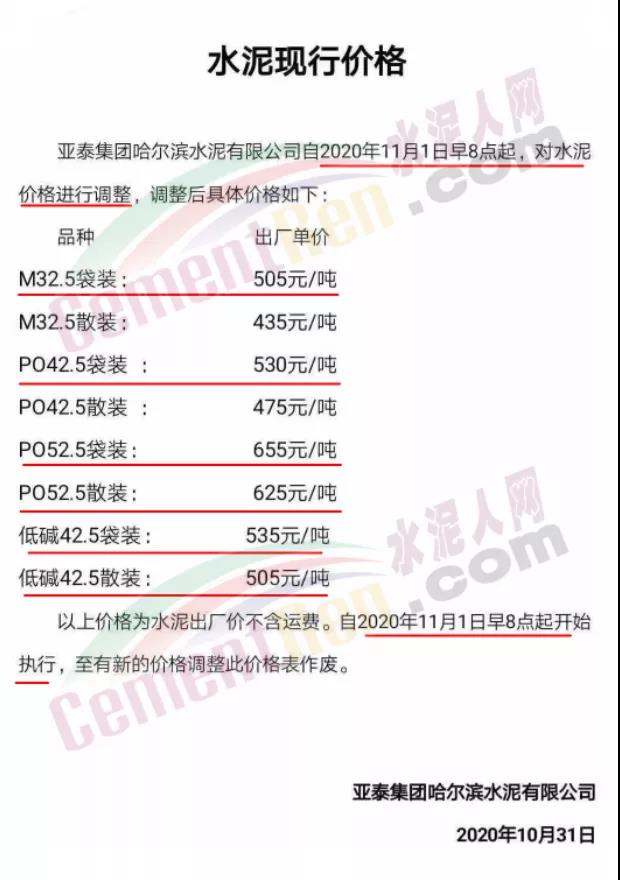 據水泥人網此前報道,近期多區域通知上調水泥價格,東北吉林某企業通知水泥價格一次性上調160元/噸,黑龍江主要品牌企業北方水泥、亞泰水泥一次性上調130~150元/噸。