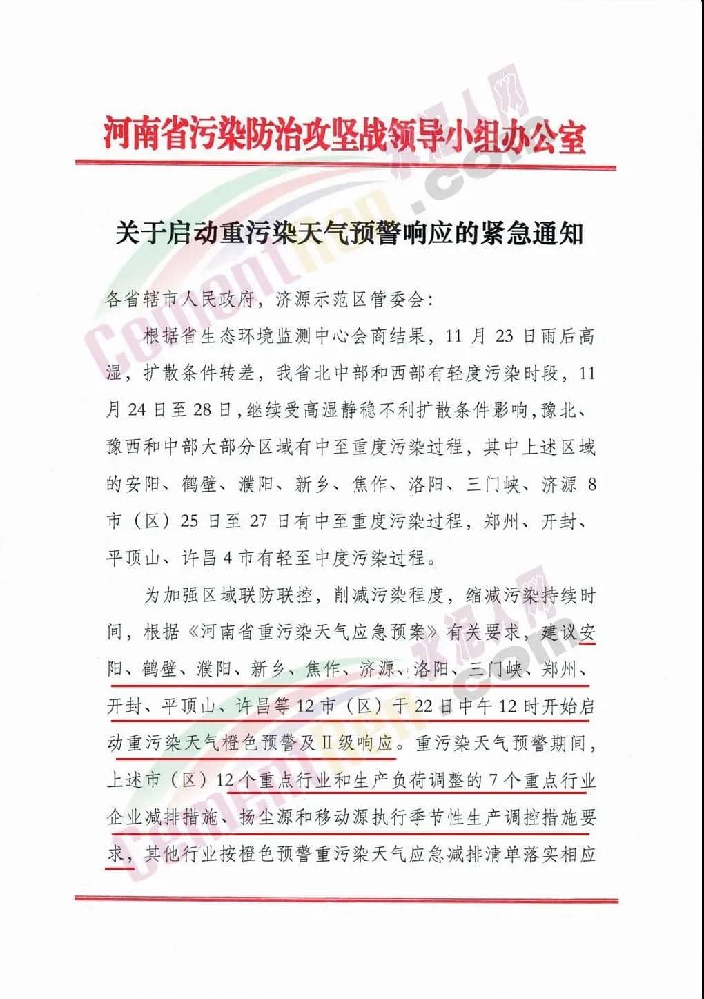 日前,河南省污染防治攻堅戰(zhàn)領(lǐng)導小組辦公室發(fā)布《關(guān)于啟動重污染天氣預警響應的緊急通知》稱,為加強區(qū)域聯(lián)防聯(lián)控,削減污染程度,縮減污染持續(xù)時間,根據(jù)《河南省重污染天氣應急預案》有關(guān)要求,建議安陽、鶴壁、濮陽、新鄉(xiāng)、焦作、濟源、;洛陽、三門峽、鄭州、開封、平頂山、許昌等12市(區(qū))于22日中午12時開始啟動重污染天氣橙色預警及Ⅱ級響應。重污染天氣預警期間,上述市(區(qū))12個重點行業(yè)和生產(chǎn)負荷調(diào)整的7個重點行業(yè)企業(yè)減排措施、揚塵源和移動源執(zhí)行季節(jié)性生產(chǎn)調(diào)控措施要求,其他行業(yè)按橙色預警重污染天氣應急減排清單落實相應級別的應急減排措施。