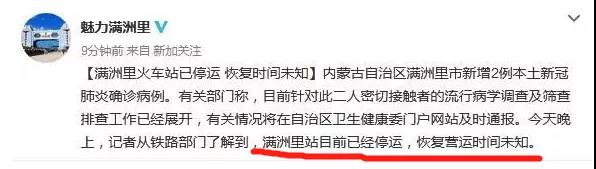 內蒙古滿洲里市所有人員核酸檢測,火車停運、學校停課、公共場所暫停營業(yè)!