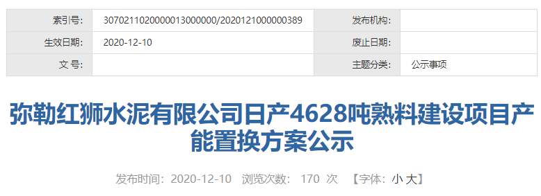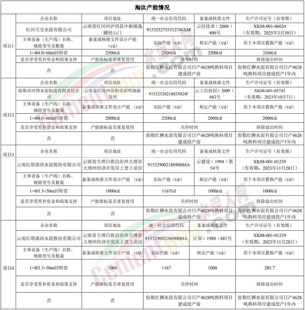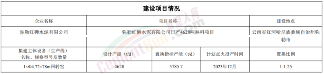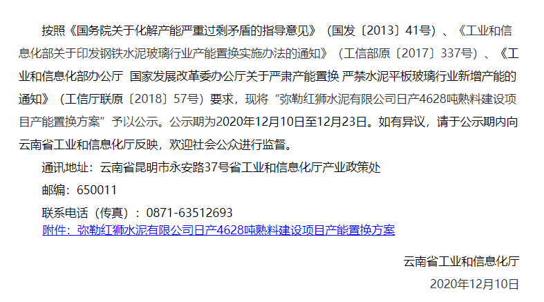 日前,云南省工業和信息化廳發布《彌勒紅獅水泥有限公司日產4628噸熟料建設項目產能置換方案公示》公示期為2020年12月10日至12月23日?!稄浝占t獅水泥有限公司日產4628噸熟料建設項目產能置換方案》顯示,將通過1:1.25置換比例退出四條生產線合計5785.7t/d產能在云南省紅河哈尼族彝族自治州彌勒市境內新建一條日產4628噸熟料生產線(1×Φ4.72×78m回轉窯),計劃投產時間:2023年12月。