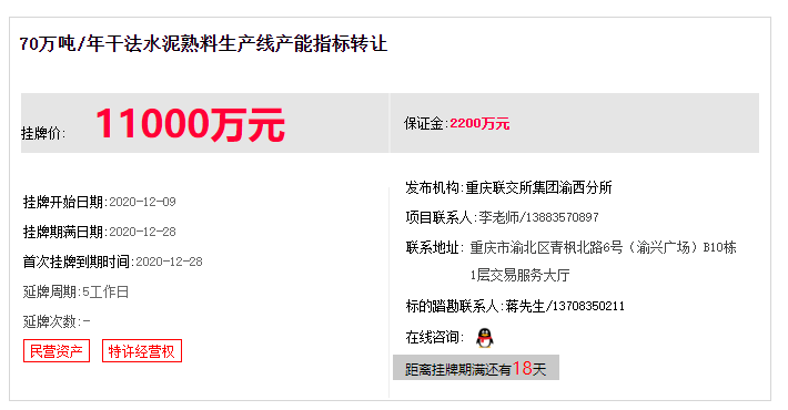 標的系70萬噸/年干法水泥熟料生產線產能指標,擬按現狀以不低于轉讓底價11000萬元協議或競價整體轉讓,標的基本情況如下: