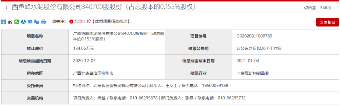 廣西魚峰水泥0.155%股份轉讓,底價為134.06萬元