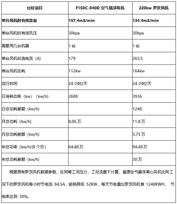 經測試:管道壓力27KPa運行時(與羅茨風機管道壓力相同),空氣懸浮風機節能32.5%。1、同等工況運行時,空氣懸浮風機比羅茨風機功率節能30%以上。2、空氣懸浮風機引用高效葉輪直接連接功能,省去了中間傳動裝置,具有無機械接觸、無振動、無需潤滑、易于按裝等特性,其噪聲由原先110分貝降低到78分貝,遠低于國家規定噪音限值80分貝,同時減少了對設備維護保養頻率,節省潤換系統使用的潤換油,避免生產現場的二次污染等。