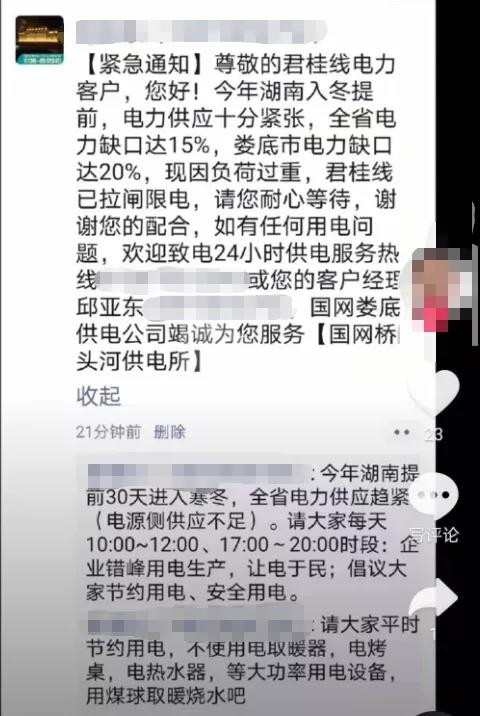 湖南長沙:已開展有序用電工作,當前有序用電時間段(用電高峰時段)為:每天10:30-12:00、16:30-20:30。為緩解全市用電緊張壓力,做到科學用電、合理用電、節約用電,避免因用電負荷缺口造成生產、生活不便,長沙市發展改革委特向廣大市民倡議,全市所有空調一律控制在20℃以下,不使用電爐、電烤爐等高耗能電器。湖南益陽:根據益陽市工業和信息化局關于印發《益陽電網2020年迎峰度冬有序用電預案》的通知,我縣即日起17:00-20:00關停景觀燈,路燈減半開啟。待上級通知后再恢復正常。請廣大市民予以諒解!