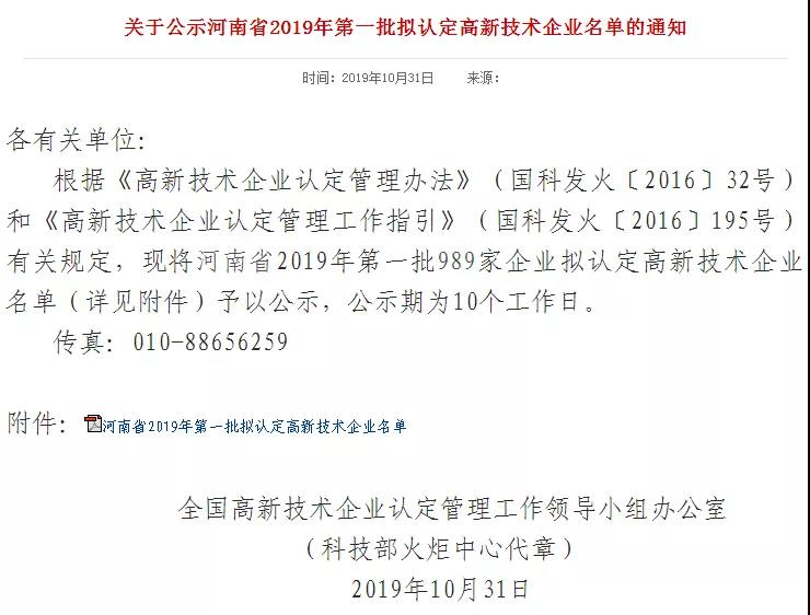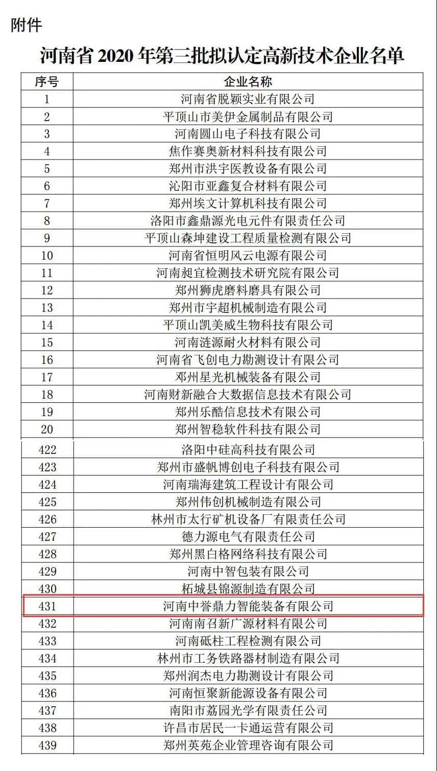 根據國家《高新技術企業認定管理辦法》(國科發火〔2016〕32號)和《高新技術企業認定管理工作指引》(國科發火〔2016〕195號)有關規定,全國高新技術企業認定管理工作領導小組辦公室12月初在官方網站對河南省2020年第三批擬認定高新技術企業名單進行公示。經過為期10天的公示階段,河南中譽鼎力智能裝備有限公司順利通過“國家高新技術企業”認定。