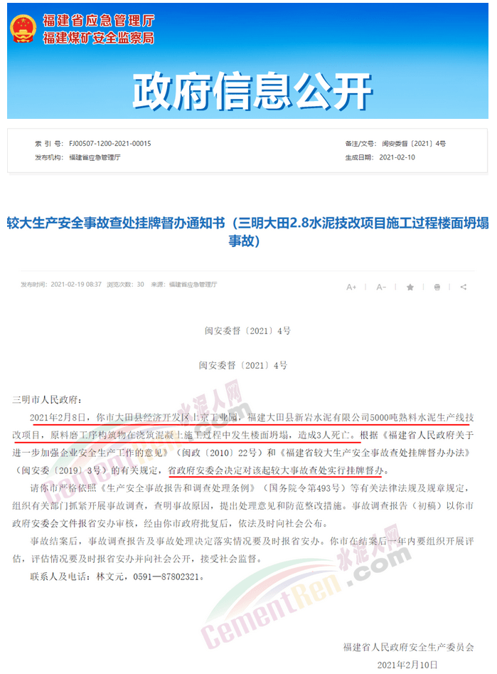 據水泥人網了解,福建省應急管理廳發布較大生產安全事故查處掛牌督辦通知書(三明大田2.8水泥技改項目施工過程樓面坍塌事故)稱,2021年2月8日,三明市大田縣經濟開發區上京工業園,福建大田縣新巖水泥有限公司5000噸熟料水泥生產線技改項目,原料磨工序構筑物在澆筑混凝土施工過程中發生樓面坍塌,造成3人死亡。 依據有關規定,福建省政府安委會決定對該起較大事故查處實行掛牌督辦。
