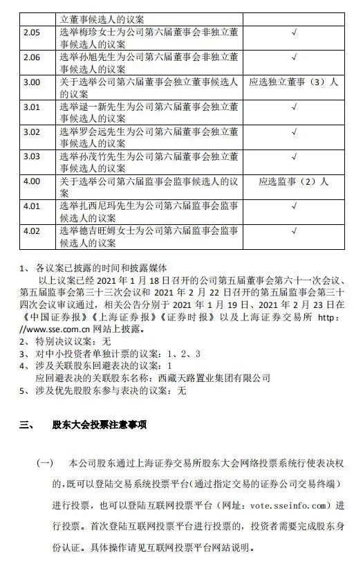 公司第五屆監(jiān)事會任期已屆滿。根據(jù)《公司法》《證券法》《上海證券交易所股票上市規(guī)則》及其他法律法規(guī)和《公司章程》之規(guī)定,會議審議通過了第六屆監(jiān)事會監(jiān)事候選人的議案,公司第六屆監(jiān)事會監(jiān)事候選人由公司股東單位推薦:扎西尼瑪先生由西藏天路置業(yè)集團有限公司推薦;德吉旺姆女士由西藏天海集團有限責任公司推薦。