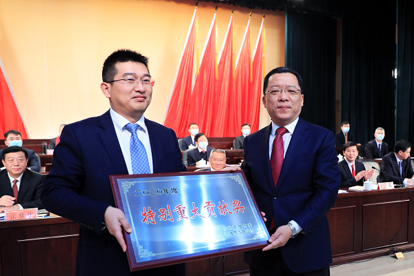 2月18日上午,銅陵市政府組織召開全市雙招雙引暨重大項目攻堅年動員大會。市委書記丁純同志出席會議并講話,市委副書記、市長胡啟生同志主持會議。大會首次對全市有突出貢獻的、發展快的、質態好的企業進行了星級評定和表彰。銅陵海螺榮獲“特別重大貢獻獎”“畝均效益貢獻獎”“五星級企業”稱號,公司總經理劉慶新同志榮獲“明星企業家”稱號,并代表公司接受市委書記丁純同志的現場授牌。