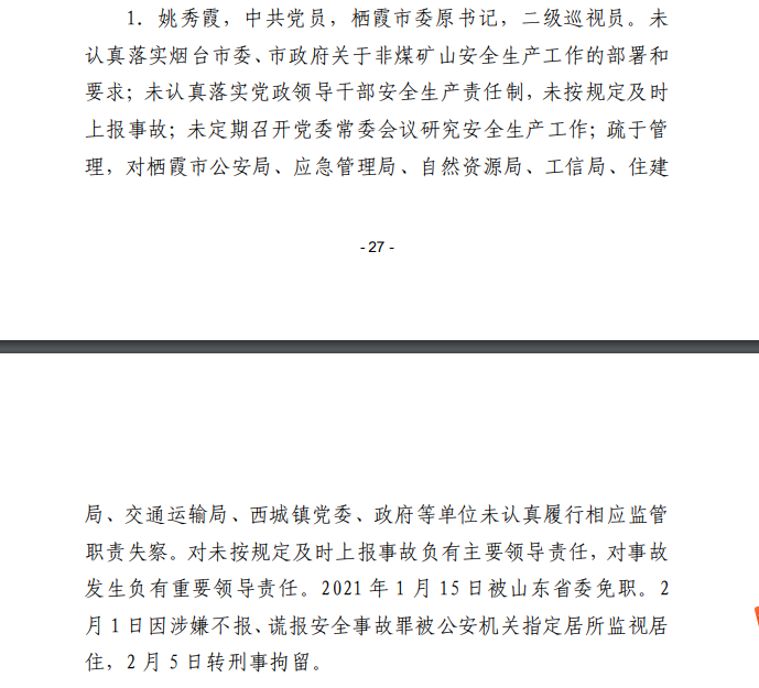 姚秀霞,棲霞市委原書記,二級巡視員。未認真落實煙臺市委、市政府關于非煤礦山安全生產工作的部署和要求;未認真落實黨政領導干部安全生產責任制,未按規定及時上報事故;未定期召開黨委常委會議研究安全生產工作;疏于管理,對棲霞市公安局、應急管理局、自然資源局、工信局、住建局、交通運輸局、西城鎮黨委、政府等單位未認真履行相應監管職責失察。對未按規定及時上報事故負有主要領導責任,對事故發生負有重要領導責任。2021年1月15日被山東省委免職。2月1日因涉嫌不報、謊報安全事故罪被公安機關指定居所監視居住,2月5日轉刑事拘留。