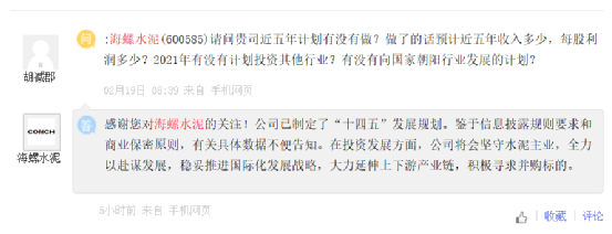 海螺水泥上市公司回復(fù)稱(chēng),公司已制定了“十四五”發(fā)展規(guī)劃。鑒于信息披露規(guī)則要求和商業(yè)保密原則,有關(guān)具體數(shù)據(jù)不便告知。在投資發(fā)展方面,公司將會(huì)堅(jiān)守水泥主業(yè),全力以赴謀發(fā)展,穩(wěn)妥推進(jìn)國(guó)際化發(fā)展戰(zhàn)略,大力延伸上下游產(chǎn)業(yè)鏈,積極尋求并購(gòu)標(biāo)的。