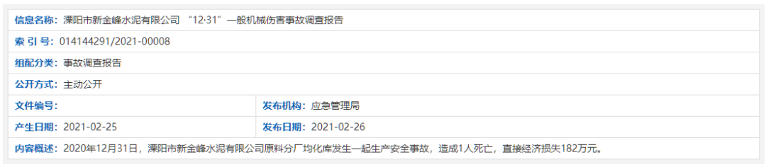 日前,溧陽市人民政府官方網站發布了 《溧陽市新金峰水泥有限公司 “12·31”一般機械傷害事故調查報告》稱,2020年12月31日,溧陽市新金峰水泥有限公司原料分廠均化庫發生一起生產安全事故,造成1人死亡,直接經濟損失182萬元。死亡人員為新金峰公司原料分廠均化庫堆取料機崗位工。