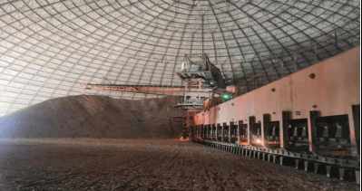 新金峰公司有2條日產4500噸水泥生產線,分別為A線和B線,每條生產線設有獨立的均化庫(運用堆取料技術實現原料的初步均化,兼具貯存與均化功能),每座均化庫有一臺圓形堆取料機(以下簡稱堆取料機),為石灰石堆料和取料一體機。上部為回轉懸臂式堆料機(以下簡稱堆料機),用于石灰石分層堆料(使不同碳酸鈣含量的石灰石分布均勻),下部為橋式刮板取料機(以下簡稱取料機),用于均化后石灰石取料。(如圖一)