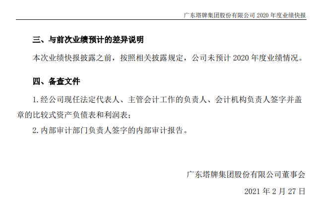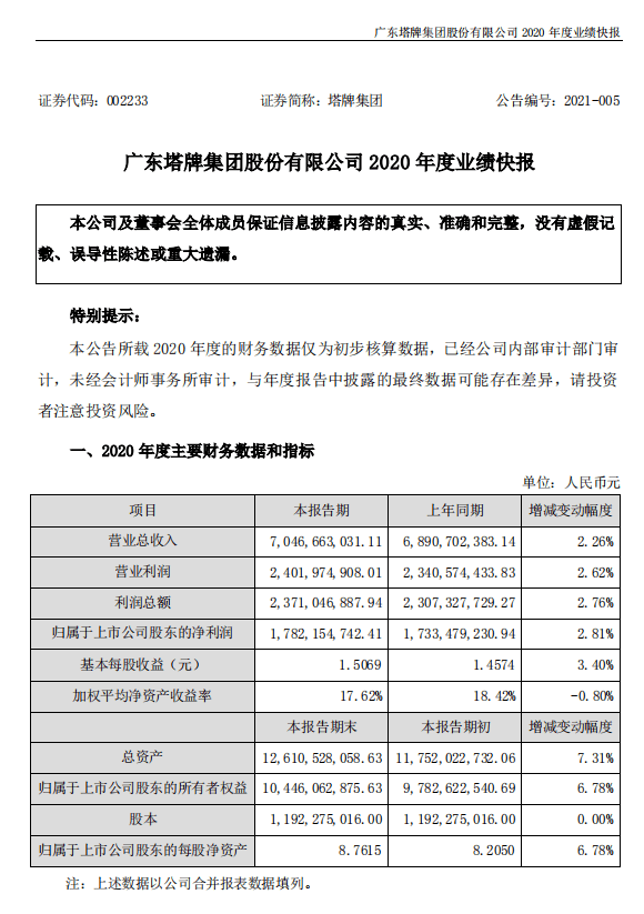塔牌集團(002233)2月26日晚間發布業績快報,2020年營業收入為70.47億元,同比增長2.26%;凈利潤17.82億元,同比增長2.81%;基本每股收益1.51元。