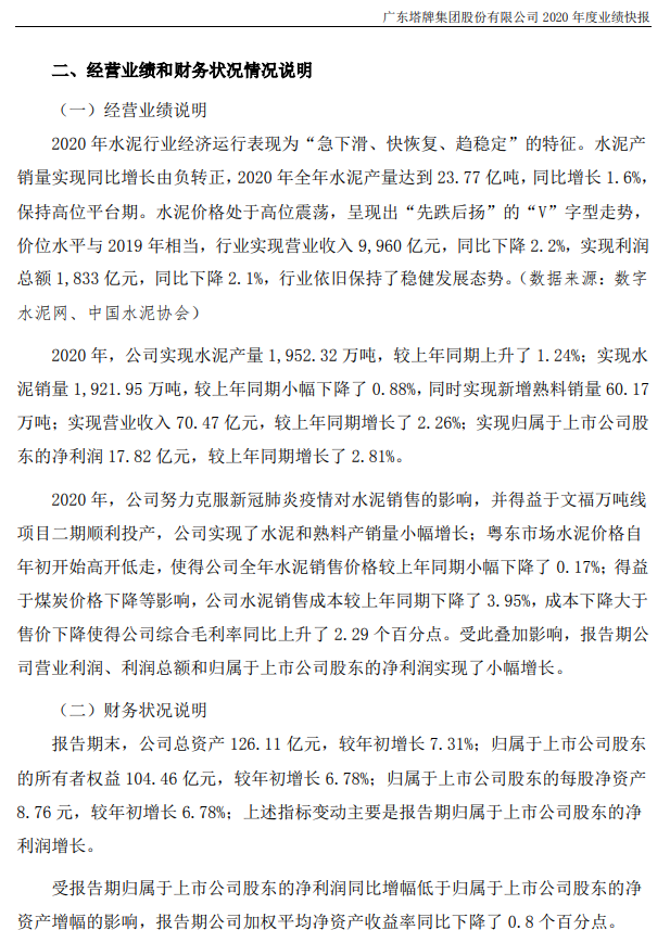 2020年,公司努力克服新冠肺炎疫情對水泥銷售的影響,并得益于文福萬噸線項目二期順利投產,公司實現了水泥和熟料產銷量小幅增長;粵東市場水泥價格自年初開始高開低走,使得公司全年水泥銷售價格較上年同期小幅下降了0.17%;得益于煤炭價格下降等影響,公司水泥銷售成本較上年同期下降了3.95%,成本下降大于售價下降使得公司綜合毛利率同比上升了2.29個百分點。受此疊加影響,報告期公司營業利潤、利潤總額和歸屬于上市公司股東的凈利潤實現了小幅增長。公告原文如下: