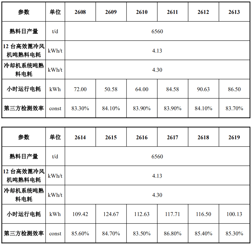 經瑞晨環保改造后,四川國大12臺高效篦冷風機F1-14302~F12-14313運行穩定,經過第三方(綿陽旗諾)標定,運行效率分別高達83.50%、85.60%、84.60%、84.00%、84.30%、85.00%、84.90%、83.60%、83.50%、85.00%、86.00%、83.80%。熟料提產至6589t/d后,12臺高效篦冷風機噸熟料電耗降低至4.36kWh/t,篦冷機系統熟料電耗降低至4.51kWh/t滿足技術合同約定的噸熟料電耗≤4.93kWh/t。