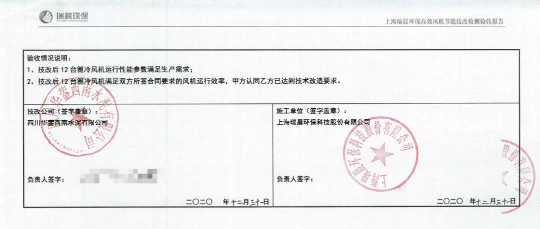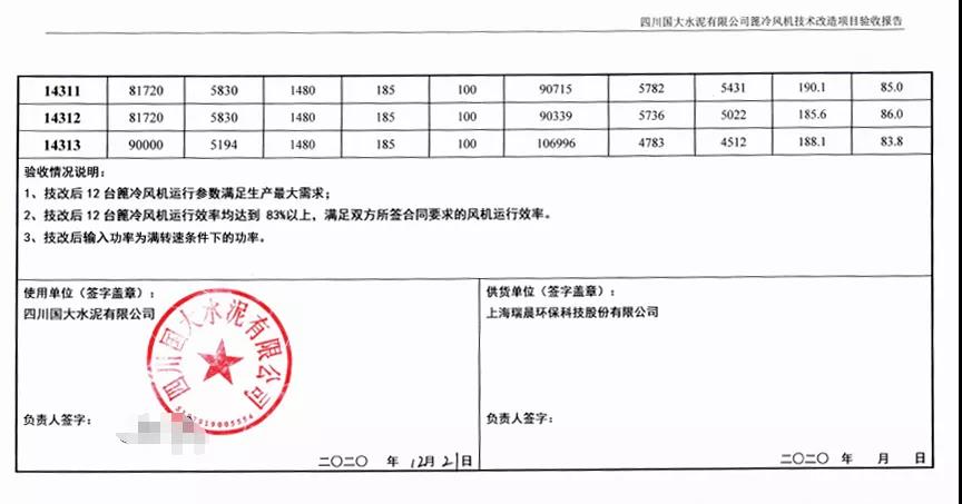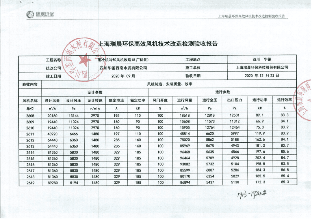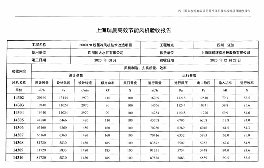 經瑞晨環保改造后,華鎣西南12臺高效篦冷風機2608-2619運行穩定,經第三方(綿陽旗諾)檢測,運行效率分別高達83.30%、84.10%、83.90%、83.90%、84.10%、83.70%、85.60%、84.70%、83.50%、86.80%、85.40%、85.30%,并在熟料提產至6560t/d后12臺高效篦冷風機噸熟料電耗降低至4.13kWh/t,篦冷機系統噸熟料電耗降低至4.30kWh/t,滿足技術合同約定的篦冷機系統噸熟料電耗≤4.73kWh/t。瑞晨環保高效篦冷風機配合成都院配套IKN第四代篦冷床的升級換代項目完美驗收,瑞晨環保高效篦冷風機得到成都院與四川華鎣西南水泥有限公司各層領導以及西南水泥高層的高度認可與一致好評。