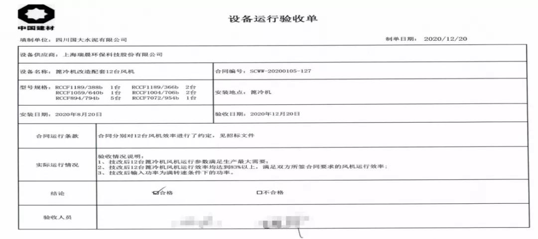 瑞晨環保高效篦冷風機配合凱盛院配套IKN第四代篦冷床的升級換代項目完美驗收,得到凱盛院與四川國大水泥有限公司各層領導以及西南水泥高層的高度認可與一致好評。